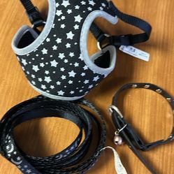 Harness, Leash and collar Set. Tiny cat or dog moon and stars harness, collar and leash set. Black and Gray. Leash is 60” long.$10Boca Raton, FL