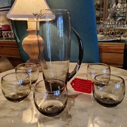 Morgantown Normandie Martini Pitcher and Glasses Set Mid Century American Glass Smoke Gray with 5 Glasses