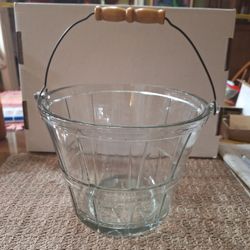 Mid-Century Anchor Hocking Clear Ice Bucket/Fruit Basket Wood & Wire Handle