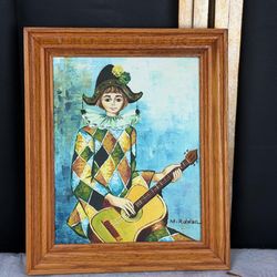 Vintage Harlequin Guitar Player Framed Painting Signed M Redwan 12.5x10.5$40Oakland, FL