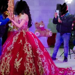 Red And Gold Sparkly Quinceneara Dress With Tail $600Geneva, FL