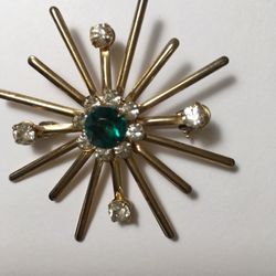 Atomic Sun Burst Brooch Emerald Colored Stone With White Stone On GoldTone Structure Used$8Valdosta, GA