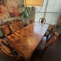 Traditional Wood Inlay Dining Table with 6 Chairs and Wood Buffet$400Flowery Branch, GA