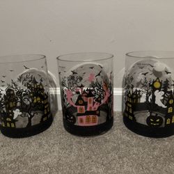 Halloween Glass Mugs Pink And Black Halloween Scene Xlarge Hand painted Set 3$50Lithonia, GA