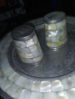 Vintage and mother of pearl shell salt and pepper and tray$45Fort Mitchell, AL