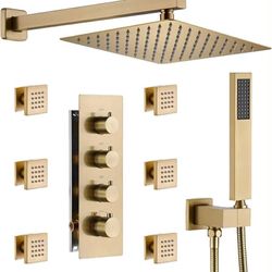 12 Inch Thermostatic Shower System in Brushed Gold, Wall Mounted Shower Head with Handheld Spray and 6 Body Jets$250Duluth, GA