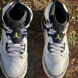 6.5y Jordan Spizike "Cement Volt" sneakers, featuring a white leather upper, black detailing, and vibrant volt green accents$80Mcdonough, GA