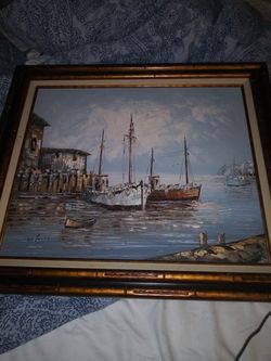 1/4 pallet painting depicting a tall ship sailing into the sunset.$80Dacula, GA