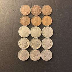 Coins – Indian Pennies/Lincoln Pennies/Liberty V Nickels/Buffalo Nickels/Jefferson Nickels – 3 Coins of each - all different dates - Total 15 Coins$20Macon, GA