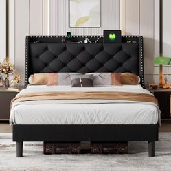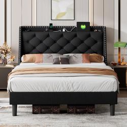Full Size Platform Bed Frame With Velvet Upholstered Headboard And Wooden Slats Support, Fully Upholstered Mattress