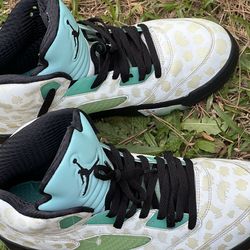 11.5 Air Jordan 5 Retro 'Island Green' features a white leather upper with a tonal leopard print, contrasting black accents on the laces, and vibrant$100Mcdonough, GA