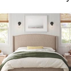elegant design bed features textured cream boucle fabric w/Tall wingback headboard$895Atlanta, GA