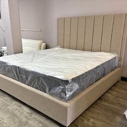 Brand new beige/cream upholstered fabric platform king and queen size bed frame/headboard - opt mattress | Pay after delivery ๐$375Atlanta, GA