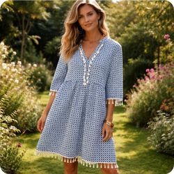 Blue Tassel-Trim Flowy Dress Women's sz L Chevron Boho Cottagecore$5Savannah, GA
