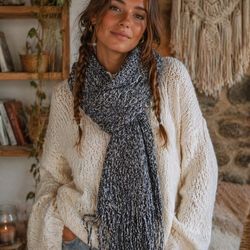 Cozy Black & Gray Fringe Knit Scarf, Metallic Sheen, Women's Accessories Boho$4Savannah, GA