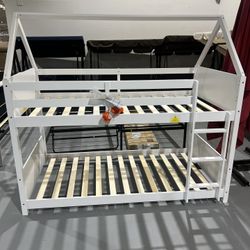 M-(Minor damage)New Twin over Twin House Floor Bunk Bed with Safety Guardrail and Ladder - White$195Morrow, GA