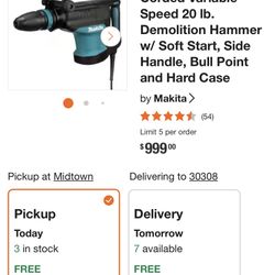 14 Amp SDS-MAX Corded Variable Speed 20lb. Demolition Hammer w/ Soft Start, Side Handle, Bull Point and Hard Case$550Tucker, GA