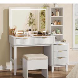 Fluted Vanity Desk with Mirror and Lights, Makeup Table with 5 Drawers and Storage Shelves, Bedroom Dressing Table with Charging Sta$230Kennesaw, GA