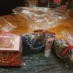 Beautifully made keepsake holiday silk gift basket with an authentic Nigerian handbag, 5 piece everyday eyes brush&compact set. Or Bath&body$55Smoke Rise, GA