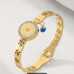 A gold stainless steel 18 k gold-plated circular portrait with blue eyes design, a bracelet with a minimalist style, fashionable and trendy retro, ver$20Suwanee, GA
