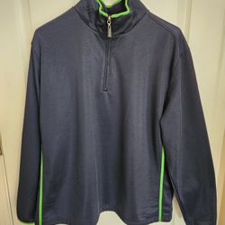 IZOD Sporty Fleece Quarter Zipper Pullover Long-Sleeved Sweater top in dark blue with green neon accents.