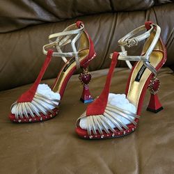 Women's Dolce & Gabbana Red Suede Metallic Gold Leather High-End Designer Luxury Buckle Heels Size 7 US$545Powder Springs, GA