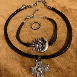 Blue & Silver Stretchable Ring, Black & Silver Cross Choker, & Crescent Moon & Sun Bracelet (Lot Of 3 Pieces of Jewelry)$18Ewa Beach, HI