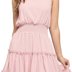(Pink)Women's Summer Sleeveless Halter Neck Mini Dress Elastic Waist Ruffled A Line Swing Party Dress$25Honolulu, HI