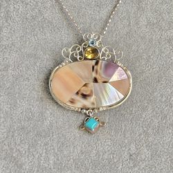 Beautiful Vintage Sterling Silver Leopard Skin and Yellow Jasper, Mother of Pearl, Citrine, Blue Topaz and Turquoise Pendant Necklace $48Dekalb, IL