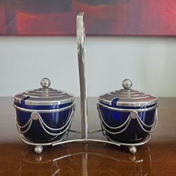 Art Deco cobalt blue glass condiment set with silver-plated holder.$45Willowbrook, IL