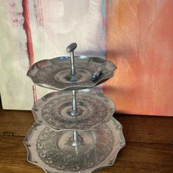 Vintage Aluminum Three Tiered Tray Elegant three-tier metal serving tray with intricate designs.$25Downers Grove, IL