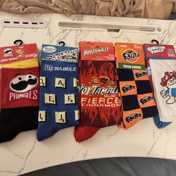 NEW Mixed lot 5 Novelty crew socks Fits men’s 6-12 Fun Prints See photos for complete details and description. Lot includes: Pringles Scrabble Ho$5Homer Glen, IL