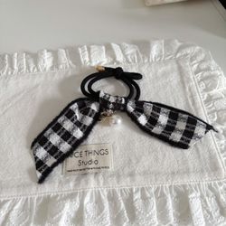 Black and white plaid hair tie with pearl decoration $5Hoffman Estates, IL