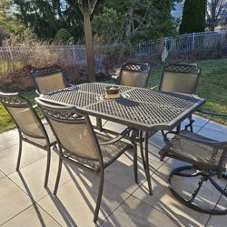 Large Rectangle Heavy Stone Patio Table With 2 Swivel And 2 Standard Chairs And 8 Cushions With Storage Box. All Aluminum Framing$900Morton Grove, IL