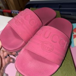 GUCCI Wild Rose Pink Rubber GG Logo Slides Heel Mules Sandals size 37$280Chicago, IL