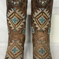 Roper Women's 9 Mai Aztec Cowboy Boots Brown Leather Turquoise Southwest 7022$175Normal, IL