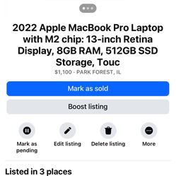 2020 Apple MacBook Pro Laptop With M2 Chip 13-inch Retina Display, 8GB RAM$1,000University Park, IL