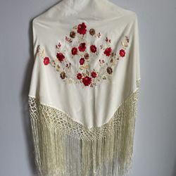 Crewel Embroidered Spanish Style Shawl Scarf Cream Red Flowers Floral$15Niles, IL