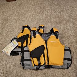 Stylish yellow and gray life vest with black accents. Perfect for water activities.