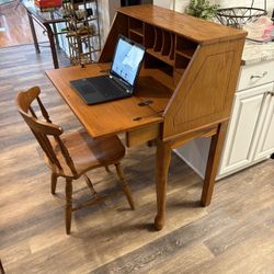 Slant front secretary desk mission style solid oak 2 lower drawers 2 cubbyhole drawers vintage W/ matching chair. Great for Computer office work area$180Glen Ellyn, IL