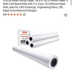 VEVOR Wide Format Paper, 36 in x 150 ft Plotter Paper, 4 Rolls CAD Bond Rolls with 2 in Core, 20 LB Bond Paper Rolls$40Chicago, IL