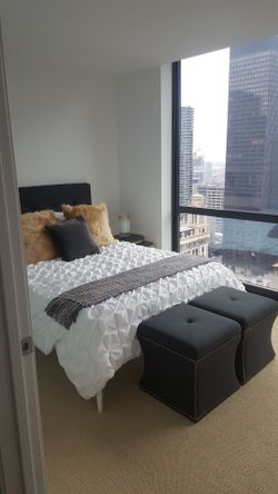 Guest bedroom set (queen size bed, 2 ottoman chairs, bedding)$750Chicago, IL