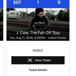 J Cole: The Fall-Off Tour: Tuesday August 11, 2026 Section 304, Row 8 Seats 1-8$150Chicago, IL