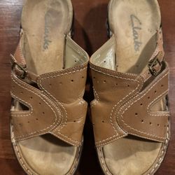 Clarks Women's Beige Leather Wedge Heel Slide Sandals Slip On - Size 6$23Carol Stream, IL