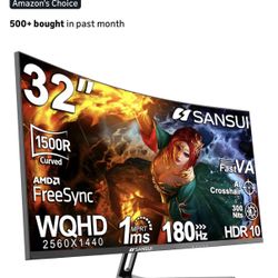 (Read Description) SANSUI 32-Inch Curved Gaming Monitor WQHD 2560x1440 180Hz Curved 1500R 1ms Response Time$190Des Plaines, IL