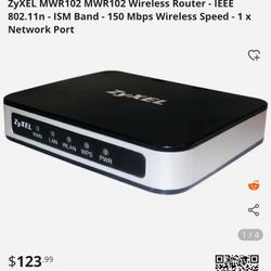 ZyXEL MWR102 MWR102 Wireless Router - IEEE 802.11n - ISM Band - 150 Mbps Wireless Speed - 1 x Network Port$80Dekalb, IL