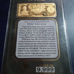 $500 Lincoln 1882 Gold Certificate Layered In 24K Gold $25Aurora, IL