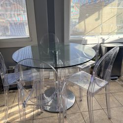 a set of clear polycarbonate 'Ghost' style chairs surrounding a glass table 39”$300Chicago, IL