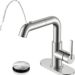 KENES Single Hole Bathroom Faucet with Pull Out Sprayer, Brushed Nickel Single Handle Pull Down Bathroom Faucets, Vanity Faucet with Pop Up Drain & De$50Aurora, IL