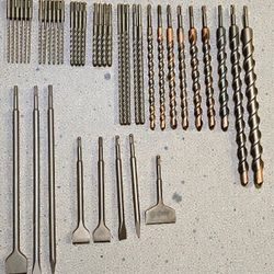 41 SDS Plus demolition and concrete drill bits and chisels, 3/16 to 1-1/4 inch in diameter and 6, 12, and 18 inch long. All are new.$70Elgin, IL